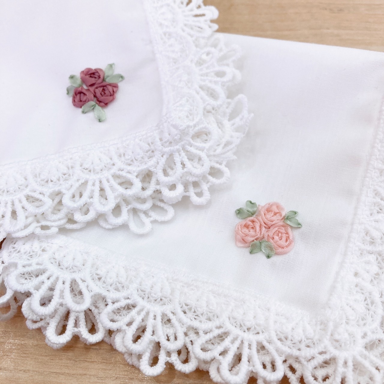 ふわふわのリボン刺繍が可愛い「プチローズのレースハンカチ」