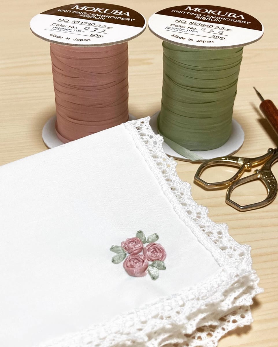 レースがあしらわれたハンカチに、リボン刺繍を施すキットです。