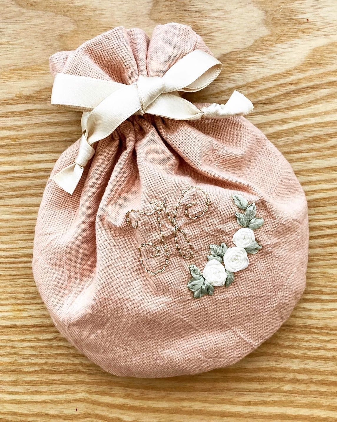 ふわふわのリボン刺繍が可愛い「プチローズのイニシャル丸巾着」